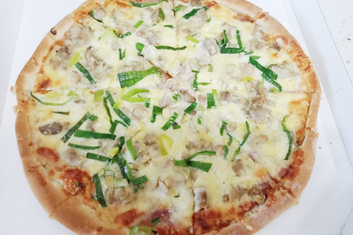 tomat + koření + česnek, šunka, cibule, klobása, anglická slanina, sýr, tvarůžky